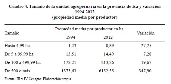 En el período comprendido entre 1994 y 2012 se ha producido un cambio significativo en la propiedad de la tierra en la provincia de Ica. La gran propiedad (superior a las 500 ha) ha crecido en 347,9%, mientras que la pequeña propiedad agropecuaria (inferior a las 5 ha) ha descendido en 27,25%, según las definiciones de propiedad media por productor establecidas[5] (ver cuadro 4). Para la construcción de los tamaños de propiedad media por productor en Ica se han utilizado los censos nacionales agropecuarios de 1994 y 2012, que son los dos últimos realizados.