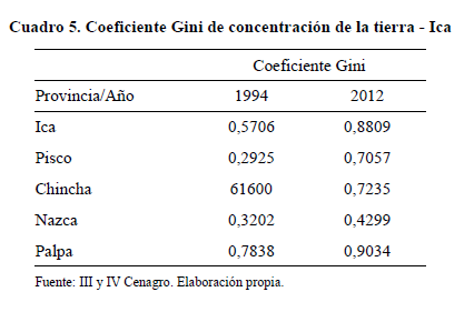 Asimismo, a partir de la información obtenida de ambos censos agropecuarios, se ha podido calcular el coeficiente Gini de concentración de la tierra para las cinco provincias del departamento de Ica (ver cuadro 5). Cabe señalar que dicho coeficiente se ha elevado en el período 1994-2012 en todas las provincias, y en algunas de ellas el incremento ha sido muy significativo, como en los casos de Ica y Pisco.