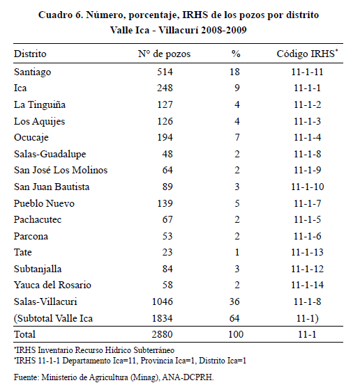 En el año 2009 se realizó el Inventario de Recursos Hídricos Subterráneos - IRHS en todo el país. El resultado fue que en Ica y Villacurí había 2880 pozos de agua subterránea. De este total, en el valle de Ica estaba el 64% de los pozos y en Villacurí el 36% restante. En la clasificación total por tipo de pozos, había 1840 tubulares, 354 mixtos y 686 de tajo abierto.