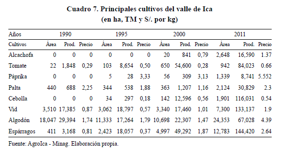 Sin embargo, en la década de 1990 se puede observar que el área de cultivo del algodón era todavía mayor que el área de cultivo de los espárragos. No obstante lo anteriormente señalado, en la década de 2000, a pesar de que el área de cultivo del algodón seguía siendo mayor que la de los espárragos, la producción en toneladas métricas de este último producto era mayor que la del algodón.
