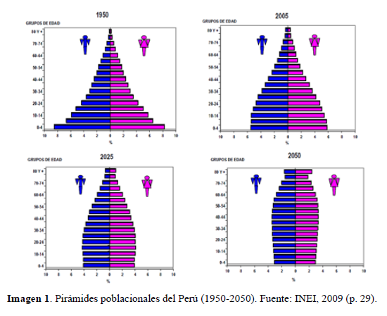 HelpAge Internacional (2015) indica que América Latina está siguiendo la misma tendencia y es una de las regiones que envejecen más rápido[2]. Del mismo modo, la distribución por edades de la población peruana ha cambiado drásticamente en menos de un siglo. El Instituto Nacional de Estadística e Informática - INEI indica que en el año 1950 nuestra población era mayoritariamente joven y el grupo de personas adultas mayores[3] era muy reducido. Actualmente esto ya no es así: el 10% de la población peruana tiene más de sesenta años y para el año 2050 este grupo alcanzará el 22%, siendo Lima —la capital del país— el espacio donde se concentrará la mayor cantidad[4] de personas de este grupo etario (INEI, 2015).