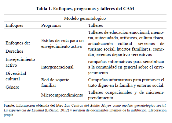 El Centro del Adulto Mayor - CAM es una intervención que busca «mejorar el proceso de envejecimiento» de sus usuarios, mostrándoles que la vejez puede y debe ser un período de desarrollo personal en el que ejerzan sus derechos plenamente, sean vistos y se sientan capaces de aportar a sus familias y la sociedad, que cuiden su cuerpo y su salud para ser sujetos autónomos, y que valoren su riqueza cultural. Esta «vejez ideal» puede ser alcanzada a través de su participación en el programa, que ha sido diseñado bajo un «modelo gerontológico» que busca identificar aquellas áreas más problemáticas durante la vejez para actuar sobre ellas y darles nuevos sentidos positivos. El modelo consiste en una reflexión teórica o discursiva que integra cuatro enfoques o marcos conceptuales. Estos dan forma a una propuesta práctica de cuatro programas que contienen una gran variedad de eventos, campañas de sensibilización, así como talleres físicos, artísticos y educativos.