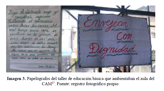Imagen 3. Papelógrafos del taller de educación básica que ambientaban el aula del CAM[17]. Fuente: registro fotográfico propio.