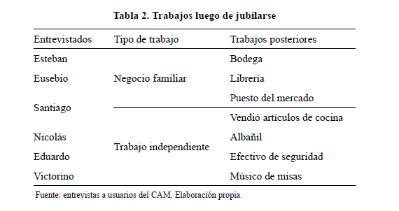 La vejez, al igual que las anteriores etapas de sus vidas, está marcada fuertemente por diferencias de género. En el aspecto laboral y económico, los hombres se jubilaron luego de cuarenta años de servicio cuando tenían entre 52 y 66 años y empezaron a recibir una pensión[21]. Luego de ello, siguieron trabajando en otras labores, como la atención de negocios familiares y venta de productos por un promedio de quince años a más. Paulatinamente dejaron de trabajar y se desligaron de sus ámbitos y redes laborales para comenzar a vivir de sus pensiones.