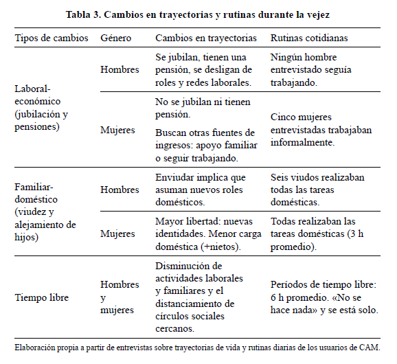 Por el contrario, las historias de los usuarios del CAM reflejan su gran resiliencia ante la adversidad y capacidad de responder a los cambios y retos que implican envejecer. Las trayectorias de vida de los entrevistados no solo evidencian que los usuarios de este centro experimentan vejeces de características distintas (económicas, físicas, género, etc.) sino también que muchos de ellos han experimentado grandes cambios y crisis durante las últimas décadas de sus vidas asociados a la muerte de sus parejas, alejamiento y crecimiento de sus hijos y el dejar de ejercer roles sociales que antes eran claves en la definición de sus identidades. Asimismo, debido a su edad cronológica, la sociedad en la que viven los había destinado a ser percibidos como «viejos», lo que implicaba ser considerado como inútil, solitario, antisocial, dependiente y enfermo.