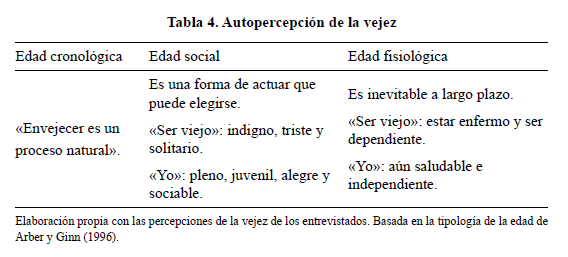 Finalmente, se indagó acerca de la manera en que los usuarios daban significado al programa y se encontró que este estaba ligado fuertemente con la forma en que entendían la vejez. Arber y Ginn (1996) dividen la edad en tres dimensiones diferentes: la edad cronológica, social y fisiológica. Los entrevistados eran conscientes de la cantidad de años que tenían, pero consideraban que a su edad cronológica había personas que eran «viejas» y otras que no.