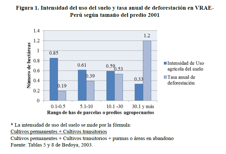 Los predios agropecuarios relativamente más grandes en el VRAE, tal como sucede en el resto de las regiones amazónicas estudiadas, se caracterizan por un uso más extensivo del suelo mientras que los predios más pequeños tienen un uso más intensivo de uso del suelo (figura 1). Ello constituye una manifestación de la vigencia y reproducción de la agricultura migratoria basada en la tala y quema del bosque y rotación de suelos, dado que la intensidad en el uso del suelo en el VRAE depende en gran medida de la extensión de la parcela. Asimismo, en la medida que se reduce el tamaño de la parcela o finca, se incrementa la intensidad de uso del suelo y se reduce la tasa anual de deforestación (figura 1) (Bedoya, 2003; Bedoya y Ramírez, 2001).