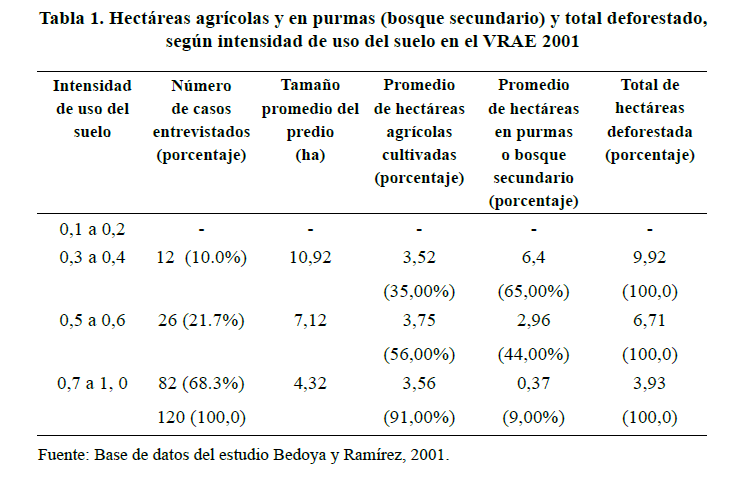 La intensidad de uso del suelo tiene un impacto en la extensión global deforestada. Los predios que tienen un uso más extensivo del suelo poseen volúmenes de deforestación mucho más altos que los que tienen un uso más intensivo del suelo. Asimismo, los predios más extensos se caracterizan por un uso muy ineficiente de los recursos naturales. Por ejemplo, los predios cuyos índices de intensidad oscilan entre 0,3 y 0,4 por un lado, y 0,5 y 0,6 por otro lado, tienen entre 3,52 hectáreas y 3,75 hectáreas agrícolas en explotación respectivamente, y para ello han deforestado 9,92 y 6,71 hectáreas, en cada caso (tabla 1). Ello representa un inmenso desperdicio, y sobre todo la destrucción de recursos forestales y naturales en general.