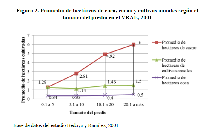 El cultivo más importante en términos de extensión ha sido y sigue siendo el cacao cuyo sistema tecnológico es fundamentalmente tradicional. Conforme se extiende el predio, el área sembrada con cacao aumenta. Ello no sucede con el cultivo de la hoja de coca el que por razones de seguridad siempre se mantiene por debajo de la media hectárea. En la figura 2 se observa muy claramente dicha tendencia. Sin embargo, el cacao sembrado en esa extensión sirve como un complemento de ingresos y no como un sustituto de la coca. En ese sentido, numerosos agricultores —en especial los más jóvenes— buscan capitalizarse rápidamente sembrando coca, teniendo en cuenta que desde que siembran los plantones de cacao hasta la primera cosecha, deben transcurrir aproximadamente cuatro años. Es por ello que el cultivo de la coca atrae más atención y cuidado para los agricultores, dado que genera mayor rentabilidad y de manera más rápida. En el año 2001, se calculaba que únicamente el 10% de superficie sembrada con plantaciones de cacao era manejada con tecnología mejorada. En estos predios se obtenían rendimientos mayores de 1000 kg/ha/año; un 30% de los predios eran conducidos con una tecnología media cuya productividad promedio oscilaba entre los 500 y 700 kg/ha/año, y el 60% restante de productores utilizaba una tecnología tradicional con rendimientos promedios que oscilaban entre 300 y 450 kg/ha/año. Cabe indicar que diez años después, en 2011, la productividad del cacao solo se situaba entre 400 y 600 kg/ha (MINAGRO, 2012, pp. 11-13). En cualquier caso, dichos rendimientos eran inferiores al promedio nacional, que supera los 750 kilogramos por hectárea. La variedad criolla o tradicional del cacao es la que predominaba en la mayor parte de las plantaciones, la cual es una mezcla de híbridos procedentes de la estación de Tulumayo en Tingo María, y que fueron trasladadas al VRAE hace más de cuarenta años. Existen otras variedades clonadas, tales como el CCN-51, promovidas por el Programa de Desarrollo Alternativo y el Ministerio de Agricultura (MINAGRO, 2012, pp. 11-13).