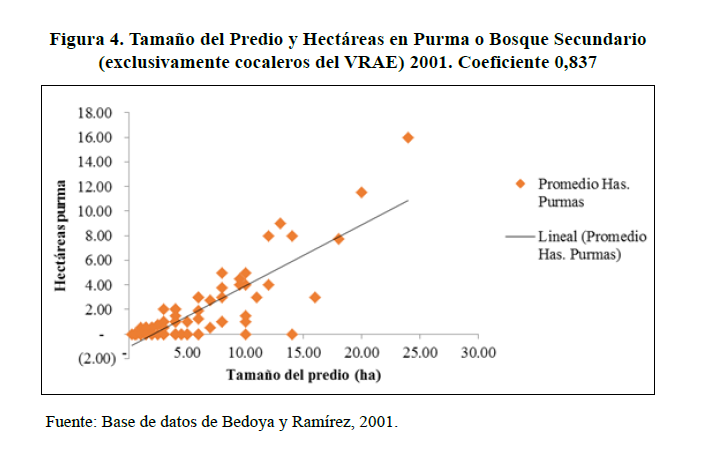 En los terrenos de coca abandonados se nota la presencia de helechos conocidos en la región como alpillo o alpillares, de 5 a 10 cm, de diámetro, sumamente difíciles de trabajar en un deshierbo normal de la plantación (CDVRAE, 1996, pp. 43-44). La difusión de helechos constituye también un signo de degradación del suelo (MINAM 2015, p. 48). En numerosos casos estos helechos han invadido tierras agrícolas en actividad. En ese contexto, usualmente los costos de recuperación de las plantaciones son tan altos que son consideradas como irrecuperables. Ello a pesar de ser el cultivo más rentable de la región. En ese sentido muchas de las tierras que suelen denominarse en descanso o en barbecho, en proceso recuperación, son en realidad suelos abandonados por su alto nivel de erosión o degradación. Se trata de tierras donde el sistema de barbecho, o recuperación natural del suelo, ha entrado en crisis. En los predios de los cocaleros, el estudio comprobó en primer lugar, tal como se demuestra en la figura 3, una relación muy visible entre tamaño del predio y las áreas en purmas o bosques secundarios. Cuanto más grande el predio mayor es también la extensión de purmas o bosque secundario. En ese sentido, un análisis basado en una correlación simple entre ambas variables arroja la cifra de 0,837, coeficiente sumamente alto. En un reciente documento (Bedoya 2016, ver figura 2) comprobamos que tal asociación existía también en todos los productores encuestados (cocaleros y no cocaleros) con un coeficiente de 0,75, también muy alto. En el presente artículo, la figura 2 que incluimos se refiere exclusivamente a los cocaleros y la tendencia no es solo la misma sino que se acentúa.
