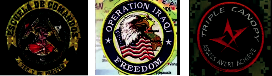 La narrativa enfoca una imagen épica de identificaciones con los distintos agentes sociales y los escenarios: la base de operaciones en Bashora, los campos de entrenamiento, los arsenales de guerra, puestos de vigilancia, el campamento y el recinto personal. En las imágenes, los objetos tienen particular importancia: armas, artillería pesada, tanques, pines, uniformes, iconos/emblemas, tarjeta de identificación («W»). Asimismo, las poses de acción (se muestran lesiones de guerra) y otros atributos del combatiente que se resaltan más que nada por el momento histriónico de las tomas. En este video se incluyen: imágenes del vuelo a Irak y una secuencia de seguimiento al Wpps principal durante su instalación en el recinto, registros de bombardeos y ataques con morteros. La parte introductoria del video muestra elementos gráficos que aluden a escudos o emblemas de carácter corporativo. En uno de ellos se ve la imagen fragmentada de un mapa entre palmeras sobre un sol naciente con predominio del rojo y el amarillo sobre negro, y la yuxtaposición de una banda horizontal multicolor encima de dos espadas cruzadas en «V» (figura 2). En el contorno del círculo se lee: Operation Iraqi Freedom y Veteran, alusivos a la operación de liberación iraquí22. El arquetipo de guerrero moderno asociado al veterano estadounidense visibiliza un atributo social clave históricamente legitimado y ahora revalidado para el guardia de seguridad: el dador de justicia. En otro nivel de interpretación, este paradigma de control de la seguridad global se manifiesta en enunciados paternalistas (Golinger, 2016)23.