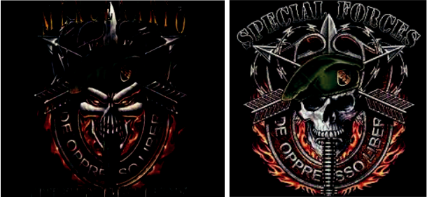 El segundo icono emblemático contiene la palabra mercenario, coronando un personaje cadavérico de mirada siniestra con boina verde (figura 3.a)24. La cabeza está atravesada por una espada, entre la parte superior del cráneo y los dientes; a la vez la traspasan dos flechas entrecruzadas. El personaje tiene como fondo ornamental orlas de fuego. Se leen otros dos textos de contorno: De oppre so liber y Operation Basora. Este es semejante a un icono de los Boinas Verdes, que en vez de mercenario, dice Special Forces (figura 3.b). La réplica del modelo militar en diferentes contextos reajusta también su iconicidad, incluyendo, sobre todo, leyendas que refieren al contexto geográfico, a las fuerzas protagonistas o al conflicto.