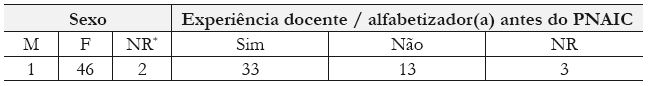 Com base nas respostas dos OE nos questionários, notamos que estes fazem parte do PNAIC a partir de convite dos responsáveis pela educação em seus municípios, contrariando, assim, o preconizado no Art. 10 da Portaria Nº 1.458, de 14 de dezembro de 2012 (BRASIL, 2012c), que estabelece critérios para a seleção dos OE. Em alguns municípios, foram indicados professores que não tinham experiência docente na alfabetização, como ilustra a tabela 1, o qual indica que 13 Orientadores de Estudos não tinham experiência docente em classes de alfabetização e que, naquele momento, estavam assumindo a função de formar professores alfabetizadores. Vejamos algumas respostas: