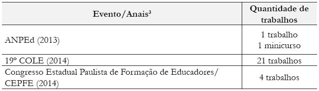 O Programa foi criado em 2012 e implantado nos municípios em 2013. Está, assim, nascendo, mas já fazendo uma busca em anais de eventos sobre pesquisas, estudos e reflexões realizadas tendo como objeto de estudo o PNAIC, considerando que este pode ser estudado com diferentes olhares: processo de alfabetização (linguagem e matemática), leitura, escrita, prática do professor alfabetizador e políticas públicas. Assim sendo, encontramos os seguintes trabalhos (Tabela 2).