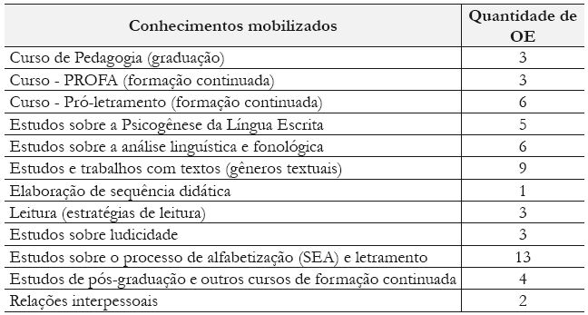 Notamos que a mobilização dos conhecimentos para o desenvolvimento da função de OE é advinda de: a) cursos de formação inicial e continuada tais como: Graduação em Pedagogia, PROFA e Pró-letramento; b) aspectos epistemológicos e conceituais: psicogênese da língua escrita, análise linguística e fonológica e apropriação do sistema de escrita e letramento; e c) aspectos da prática pedagógica: os gêneros textuais, sequência didática, estratégias de leitura e a ludicidade. Isso indica que essa é uma função que, para ser efetivada, requer uma base de conhecimento sólida, mas também flexível que possa oportunizar a construção de experiências tanto para o formador quanto para os professores alfabetizadores, tendo em vista que o "aprender a ensinar" é um processo contínuo e que depende dos sujeitos envolvidos (professor, aluno, gestão) e dos contextos (MIZUKAMI, 2006).