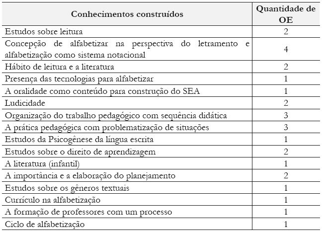 Assim, fica evidente que, nesse processo de construção de uma base de conhecimento para e na formação para formar o professor alfabetizador, os OE estão construindo conhecimentos relacionados a: aprofundamento teórico sobre leitura, psicogênese da língua escrita, oralidade, gêneros textuais, currículo na alfabetização, planejamento e ciclo de alfabetização. Em relação aos aspectos metodológicos, eles enfatizaram o uso das tecnologias, a ludicidade, a sequência didática e a problematização.