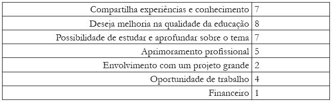 O Quadro 1 mostra a preocupação das professoras formadoras com a melhoria da qualidade da educação, a necessidade de ensinar o que aprendeu e de aprender mais.