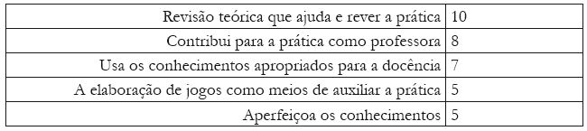 Os dados coletados demonstram que há três pontos também em destaque, sendo coerente com o Quadro 1, sobre as contribuições do PNAIC na formação profissional de cada professora formadora. São eles: a possibilidade de realizar revisão teórica sobre os temas envoltos com alfabetização; a contribuição com sua própria prática como professora, independentemente do nível de ensino; a apropriação dos conhecimentos que se materializam em sala de aula. Além disso, também há dois outros aspectos marcados: a possibilidade de elaboração de jogos, seja em Língua Portuguesa ou Matemática, para auxiliar na prática de conhecimentos sobre docência. Isso leva ao segundo aspecto: o aperfeiçoamento dos conhecimentos sobre alfabetização. Nota-se, nesse sentido, que a procura pelo conhecimento, exposto pela linguagem nos cadernos de formação, nos encontros realizados, nos cursos produzidos, efetivam-se em experiências de internalização e de apropriação dos conhecimentos científicos (VYGOTSKY, 1989), transformando-se efetivamente em discursos carregados de contrapalavra (BAKHTIN, 2003), possibilitando o que o PNAIC almeja: a transformação teórico-metodológica do professor.
