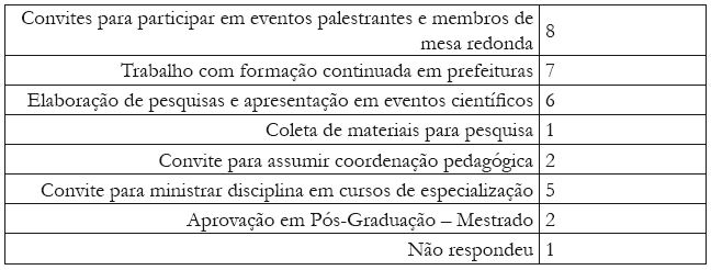 A função de professora formadora tem contribuído não somente em suas práticas como professora de Ensino Básico ou Superior, como na apropriação do conhecimento. Muitos professores tiveram, como desdobramentos da sua função, convites para participar de eventos, elaborar pesquisas e apresentar em congressos, em uma nítida demonstração de como as influências do PNAIC alteram e ampliam suas vivências sociais relacionadas à profissão.