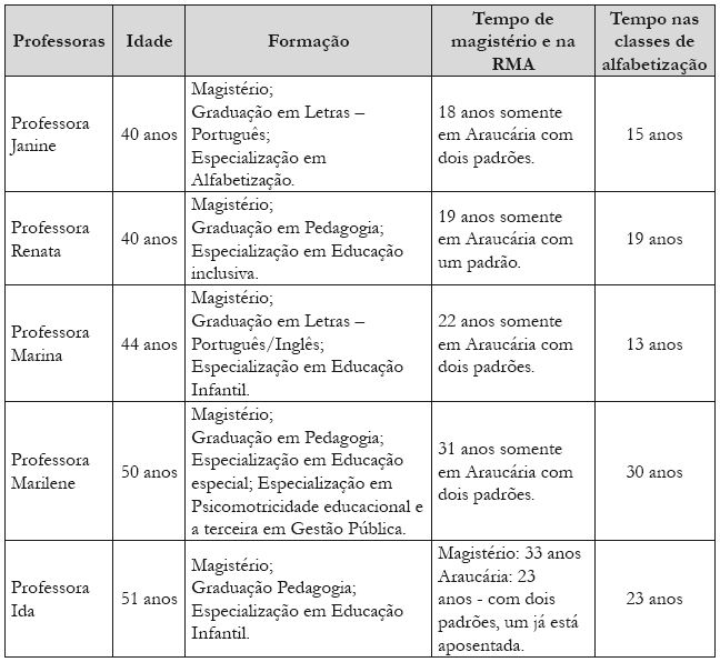 Para esclarecimento sobre a identidade e a trajetória das cinco alfabetizadoras da rede municipal de Araucária4, elaborou-se o quadro 1 a seguir:
