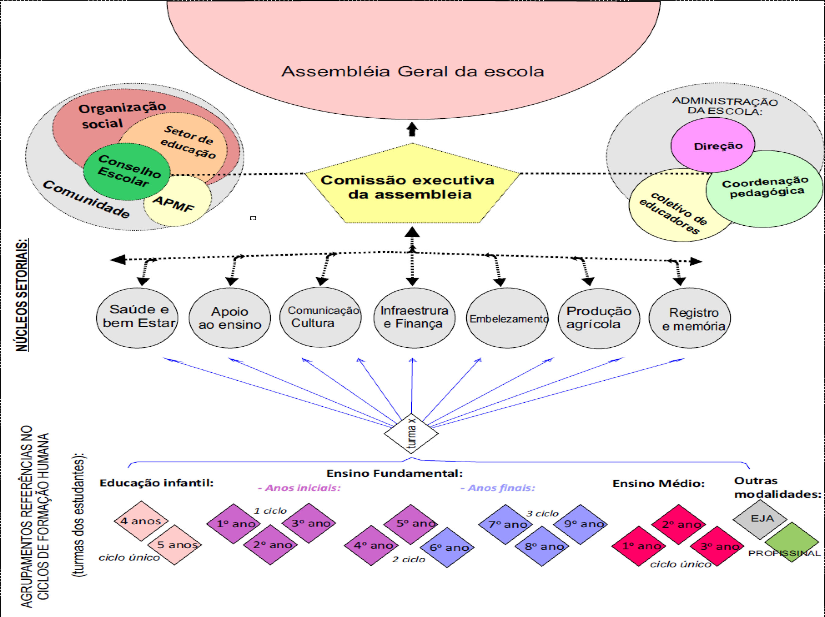 A Assembleia Escolar é a instância na qual todos os estudantes possam enxergar-se como um membro da escola "[...] com direitos e com deveres onde todos possam ver-se como um todo" (MST, 2013c, p. 23-24). Ela é composta por educadores, educandos e trabalhadores de apoio. Depois dessa primeira instância, a organização prevê a segunda instância que é a Comissão Executiva da Assembleia, composta "[...] pelos estudantes-líderes dos Núcleos Setoriais que se encarregam de aspectos específicos da vida escolar - estes Núcleos Setoriais são a terceira instância" (MST, 2013c, p. 24).