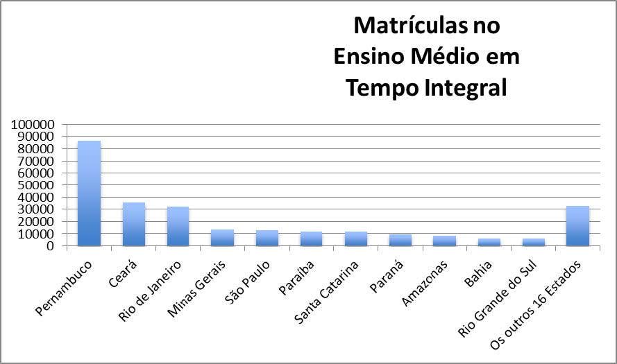 Apesar dessa situação de decréscimo no número de matrículas, de acordo com o Anuário Brasileiro Todos pela Educação 2014, tendo como referência os dados do MEC/Inep/DEED/Censo Escolar, as matrículas no Ensino Médio em tempo integral, em todo o Brasil, passaram de 205.759 (2,8% das matrículas) em 2011, para 268.431 (3,7% das matrículas), em 2012. De acordo com esses dados, com 32% do número total de matrículas nessa modalidade, Pernambuco continua em primeiro lugar em relação aos demais Estados, como podemos perceber no gráfico a seguir: