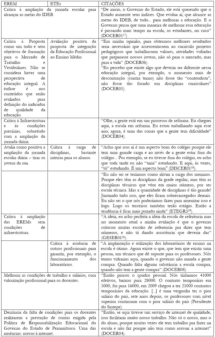 Neste último caso, sem uma grande ênfase em um padrão de infraestrutura física. Como desdobramento das questões de infraestrutura, podemos perceber nas entrevistas a avaliação de uma inadequação maior das EREMs à jornada ampliada, tendo em vista que não são dadas as condições básicas para que estudantes e docentes fiquem o dia inteiro na escola. Mas a ampliação da jornada escolar e a ênfase em disciplinas de caráter propedêutico e/ou de formação profissional, tanto nas EREMs quanto nas ETEs, são consideradas como algo que intensifica demais tanto os docentes quanto os discentes, devido à intensificação da carga de estudos em sala de aula. Nas entrevistas referentes aos dois tipos de escola há, inclusive, referências a um sentimento de encarceramento de estudantes e docentes no espaço escolar.