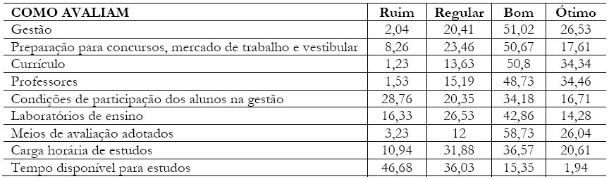 Na tabela abaixo podemos perceber como os discentes das EREMs, em respostas aos questionários, avaliam mais positivamente questões relacionadas ao trabalho docente e à gestão: como qualidade do trabalho docente; estratégias de avaliação dos docentes; currículo da educação integral (vinculando o mesmo às opções realizadas pelos docentes) e, com um pouco menos de ênfase, gestão da escola. Por outro lado, entre as avaliações mais negativas temos o tempo disponível para estudos e as condições de participação dos alunos na gestão da escola.