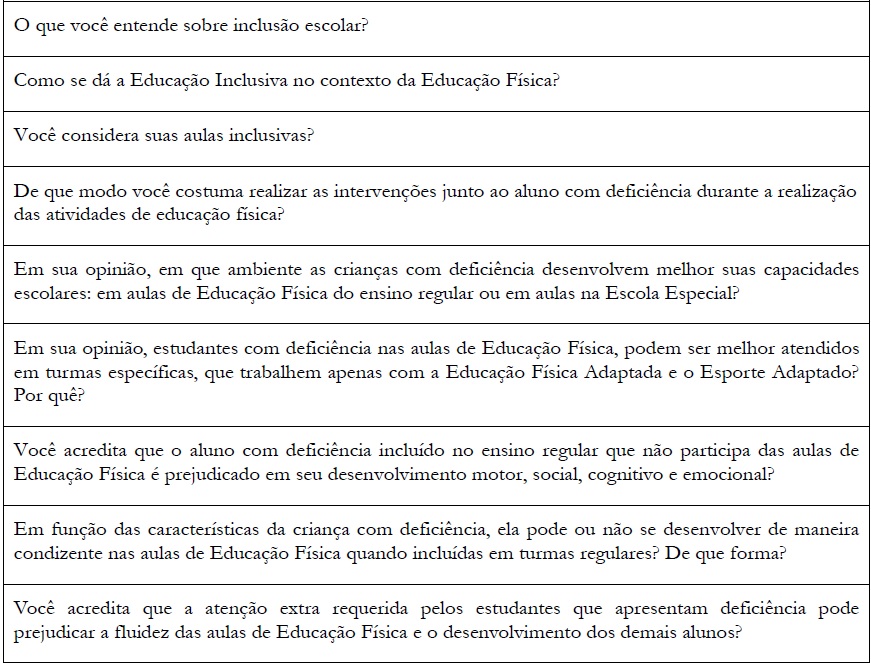 Para a coleta dos dados da presente pesquisa, utilizamos entrevistas com o objetivo de identificar as concepções dos sujeitos participantes3 em relação à inclusão escolar. Elas foram realizadas com base em um roteiro composto de 13 questões subjetivas que denominamos de Concepções e Princípios sobre Educação Física Inclusiva (Quadro 1). A utilização do roteiro teve o propósito de identificar qual era o entendimento dos professores de Educação Física sobre inclusão escolar, o que eles compreendiam do ensino da Educação Física na perspectiva inclusiva e, por fim, como os professores participantes deste estudo organizavam suas aulas a partir da presença de alunos com deficiência. No Quadro 1, abaixo, encontram-se as questões que foram usadas para este estudo.