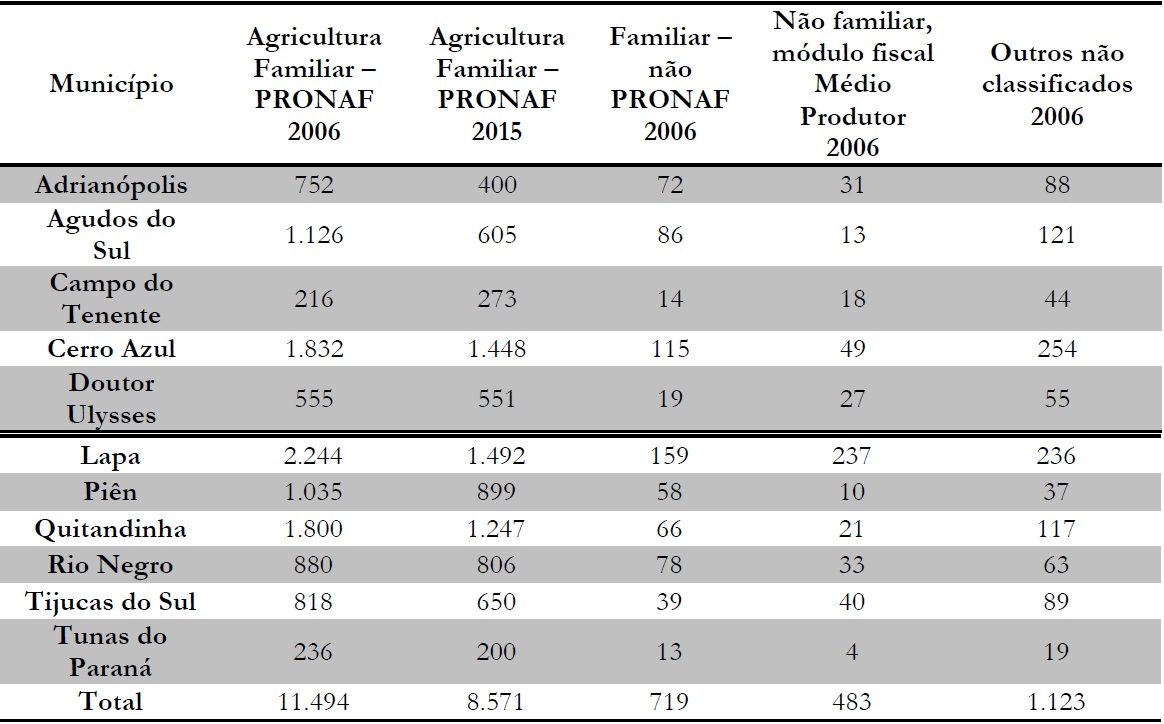 Quanto ao estabelecimento de agricultor familiar na condição de médio produtor - que diz respeito ao regime familiar, mas demanda a contratação de empregado, constituindo, assim, o emprego rural, que pode ser caracterizado como permanente, temporário, parceiro10 ou outra condição -, foi identificado que, em 2006, houve 483 estabelecimentos que se utilizaram dessa condição. Os outros considerados como “não classificados”, em 2006, representavam 1.123 estabelecimentos. A categoria “outros não classificados” foram aqueles que não se enquadraram como agricultor familiar e médio produtor. Por outro lado, essa categoria diz respeito aos grandes capitalistas, seja por extensão de terra ou por valor da produção. Vale lembrar que o Paraná é o segundo produtor de soja no país e sua economia está sustentada na exportação de commodities, como soja e milho.