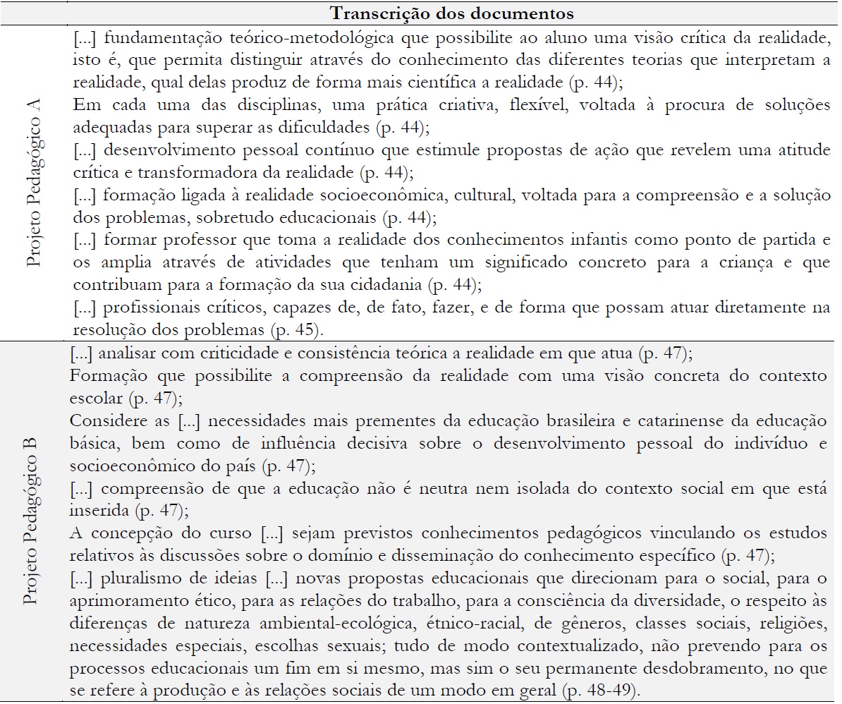 A atenção também se volta para as leituras de dois projetos do curso, instrumento de análise, com vistas à identificação de manifestações pertinentes às hipóteses de interesse deste artigo. Para manter, de certo modo, o anonimato do curso, adotamos a seguinte identificação: Projeto Pedagógico do Curso A (PPC-A) - iniciado em 2009 e que está em fase de extinção, e Projeto Pedagógico do Curso B (PPC-B), implementado em 2015. Os projetos de curso estabelecem diretrizes para a formação dos profissionais dos cursos de graduação. Para tal, alguns requisitos compõem a essência desses documentos: concepção do curso, a organização curricular, a estrutura física e administrativa, carga horária, objetivos e perfil do egresso, estrutura curricular, metodologia, avaliação da aprendizagem, disciplinas curriculares, estágios obrigatórios e não obrigatórios, trabalho de conclusão de curso, atividades complementares, ementas, bibliografias e outros instrumentos de apoio. O formato de organização e apresentação de cada PPC é de responsabilidade das IES, o que resulta em documentos singulares para cada instituição. Por decorrência, como síntese dos projetos analisados, elaboramos um quadro como indicador de alguns conceitos pertinentes ao objeto da Pedagogia e as finalidades educativas. Vale afirmar que os referidos projetos seguem as orientações das Diretrizes Curriculares Nacionais para o curso de Pedagogia - DCNP (BRASIL, 2006). No Brasil, o curso de formação de licenciados em Pedagogia, às vezes obscuramente, outras vezes nitidamente, articula-se com o movimento do objeto da Pedagogia como campo científico. É nesse processo de desenvolvimento que se produzem os projetos pedagógicos dos cursos e a organização curricular que indicam uma perspectiva de formação dos futuros profissionais pedagogos.