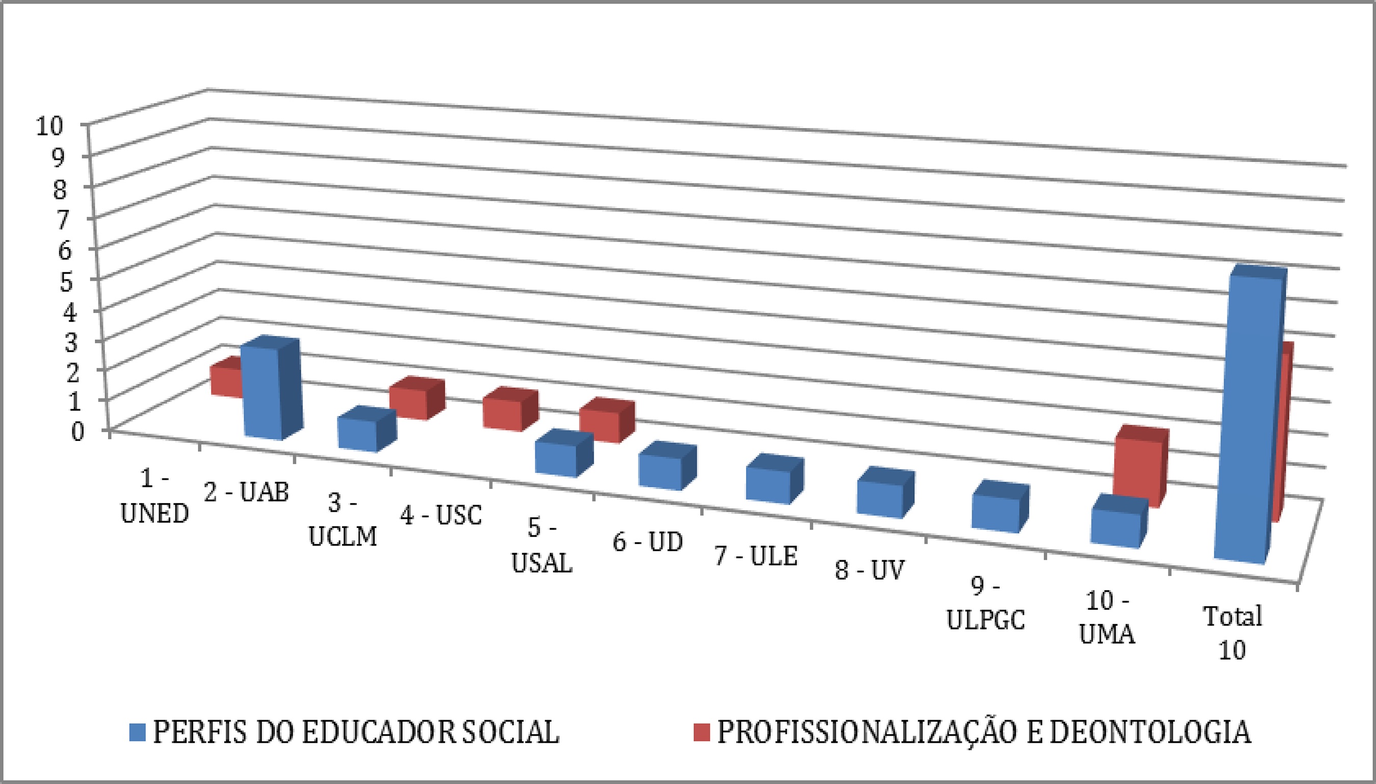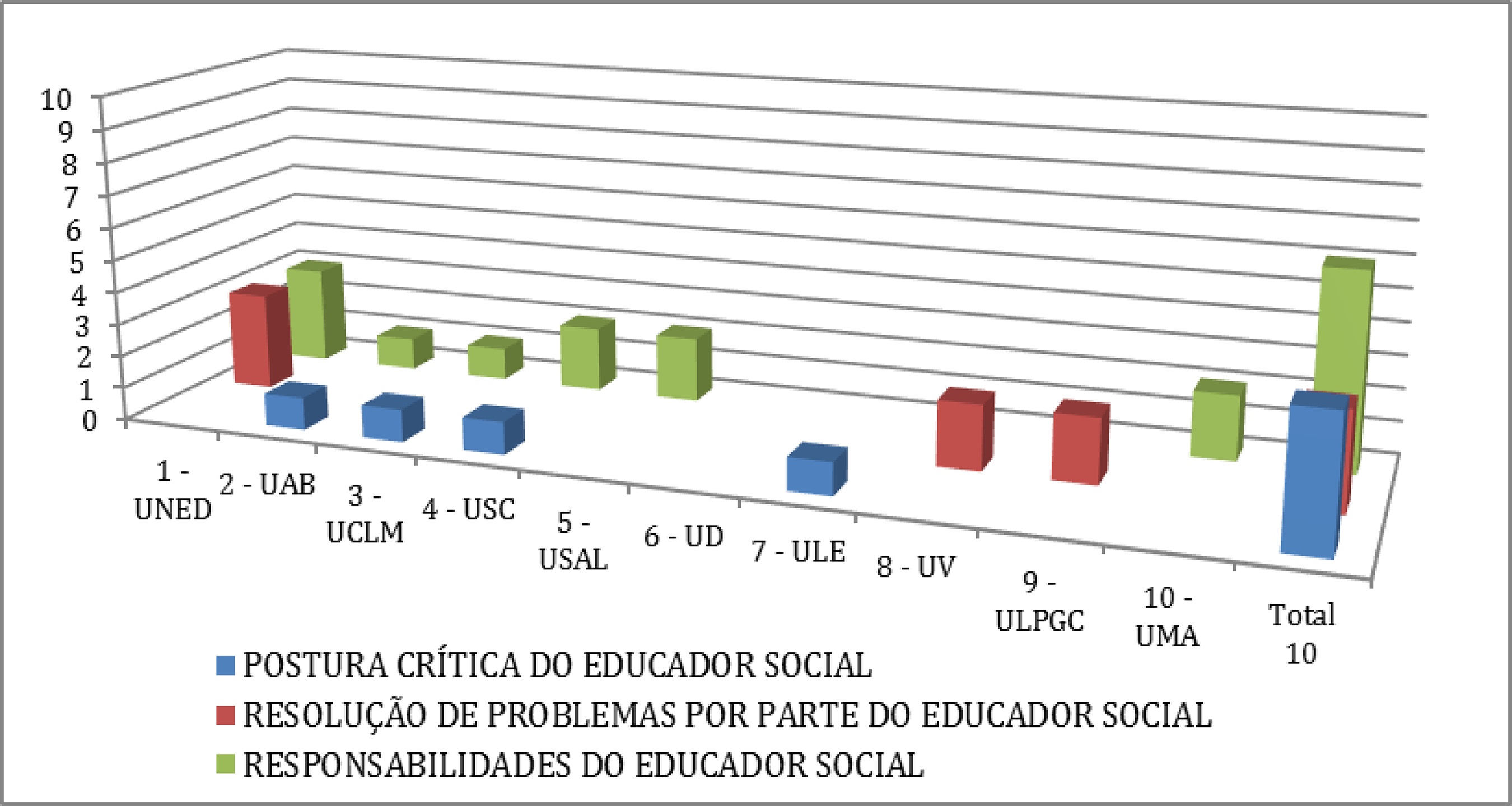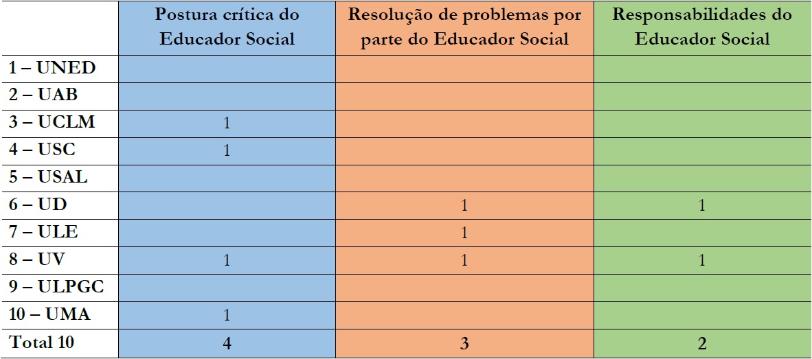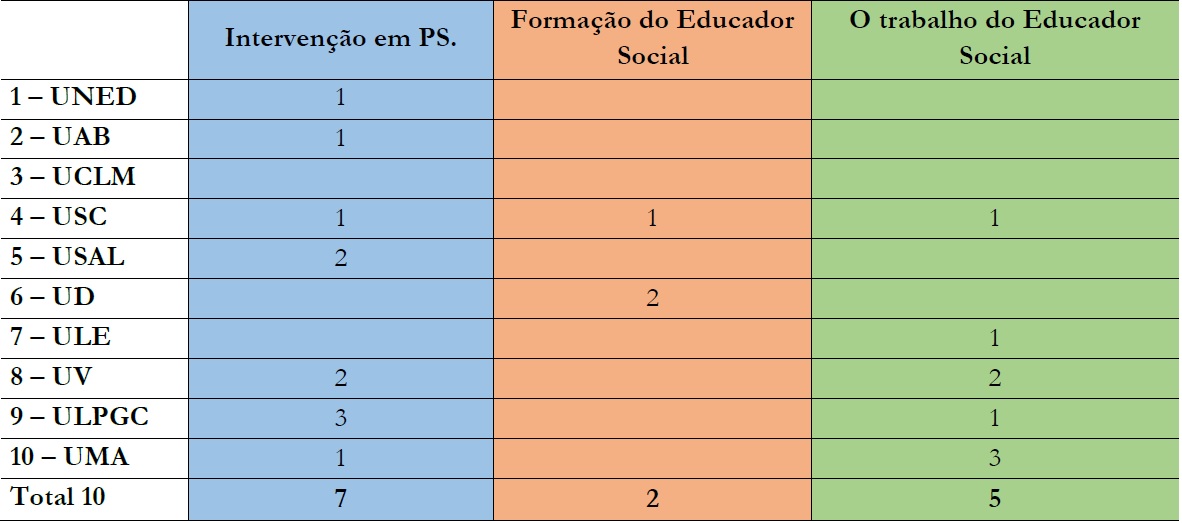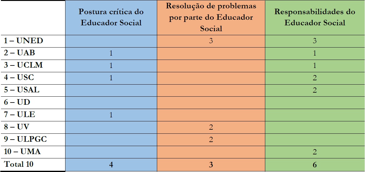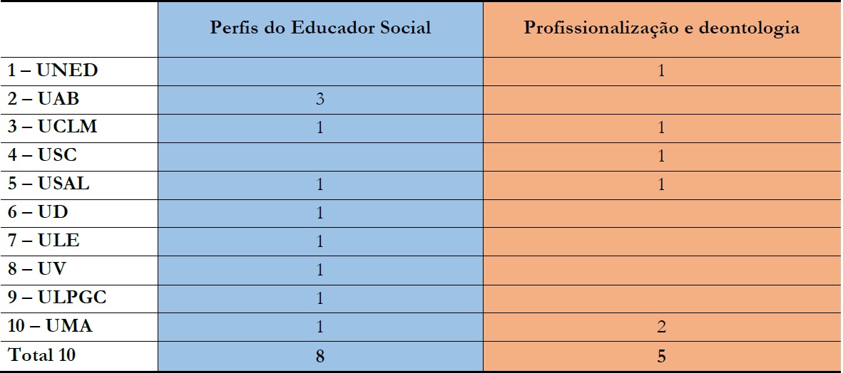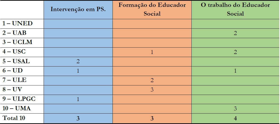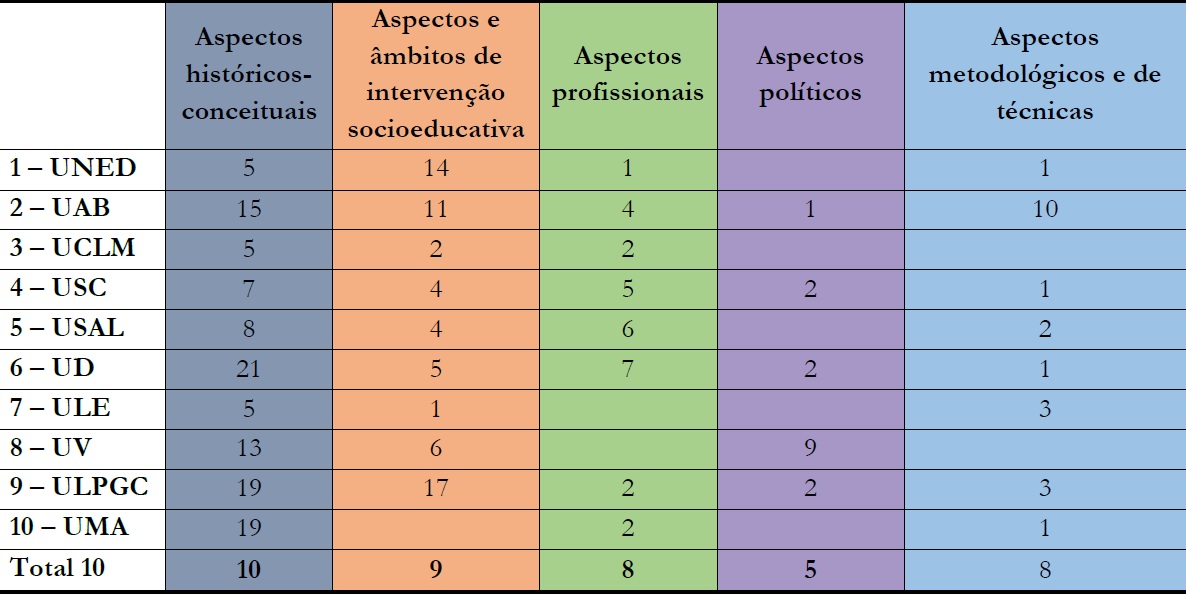 Em um primeiro momento, por meio do percurso histórico detalhado, foi possível compreender como a área adentra o meio acadêmico tornando-se uma disciplina científica e de formação profissional. Especificamente para chegar ao segundo objetivo específico, optou-se por uma análise profunda das ementas das disciplinas de Pedagogia Social que compõem o quadro de formação do curso de Graduação em Educação Social de dez universidades espanholas.