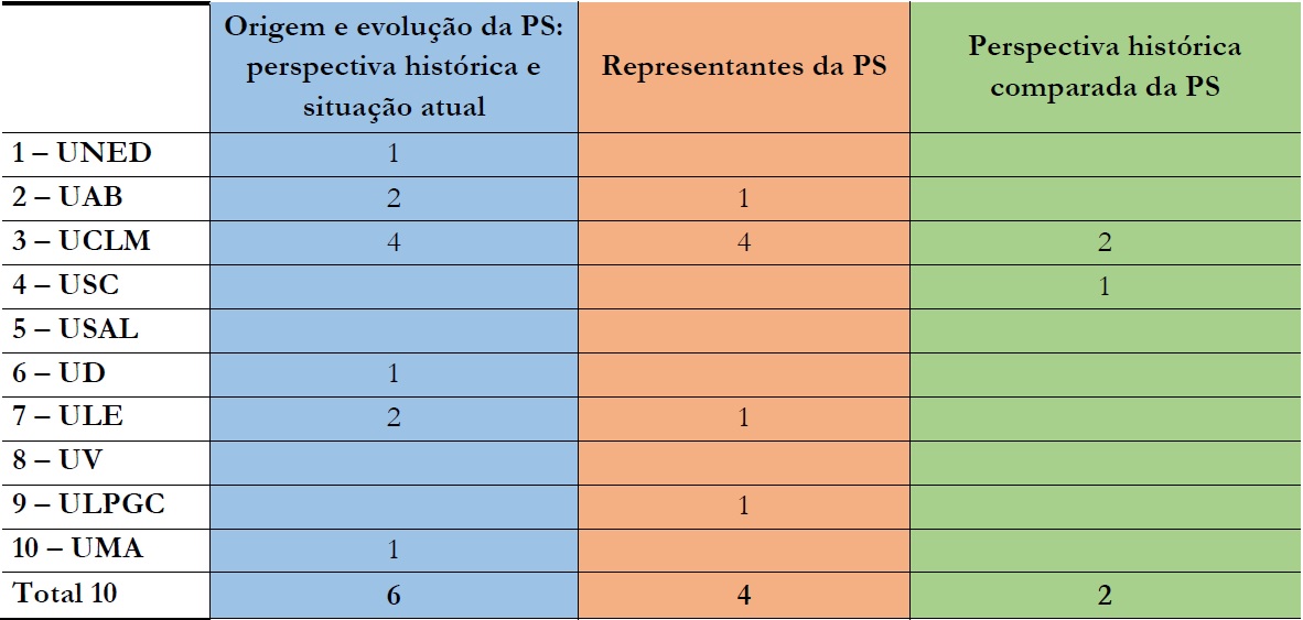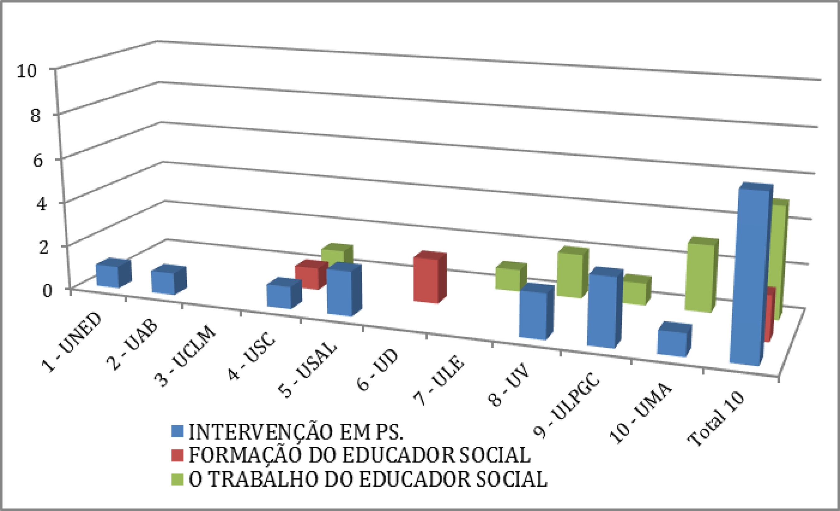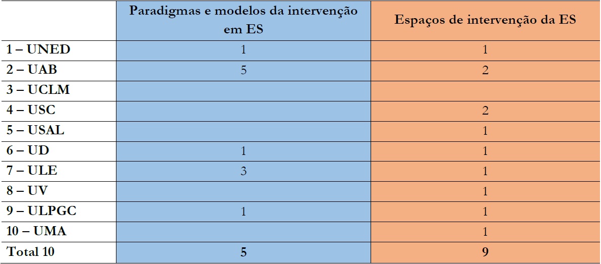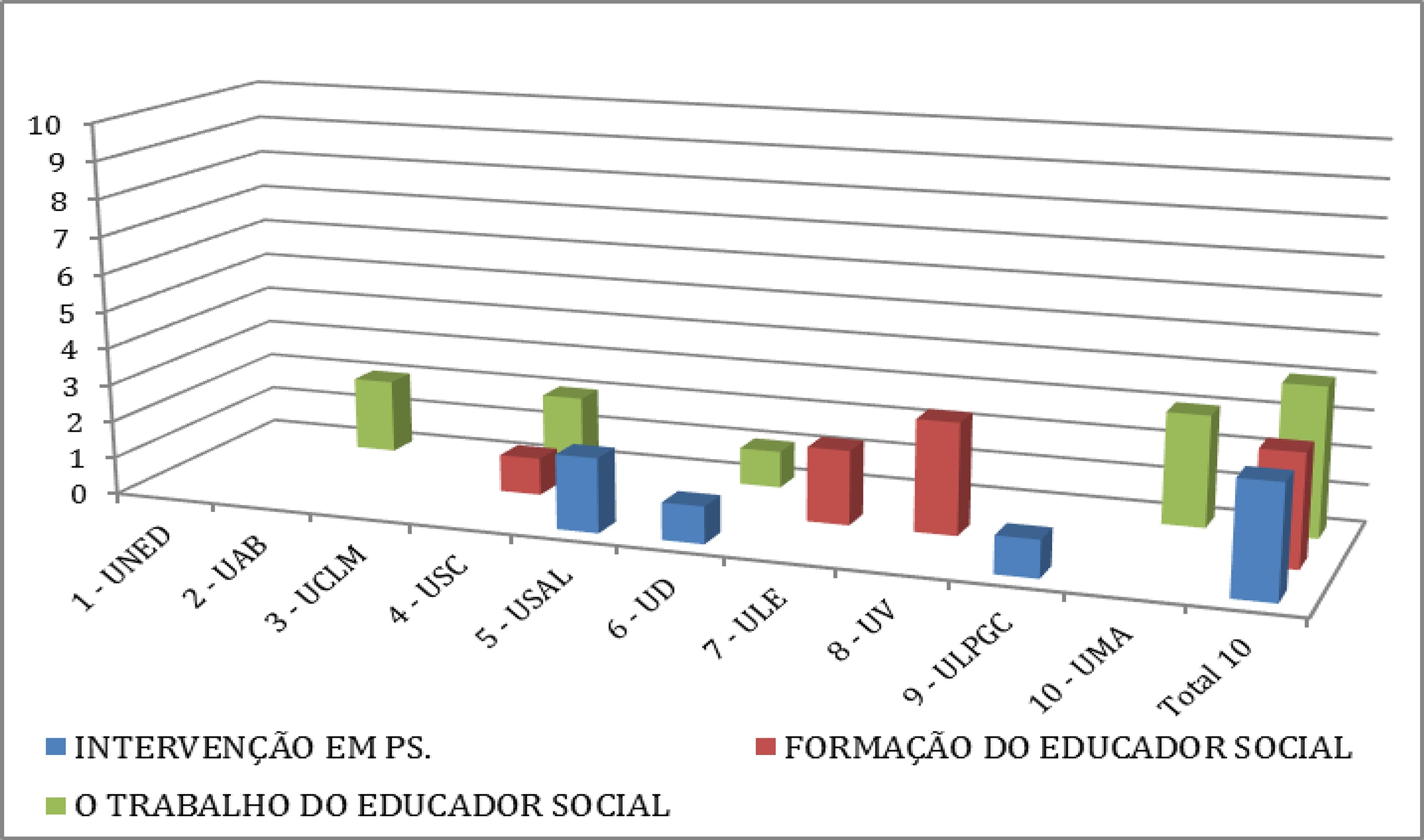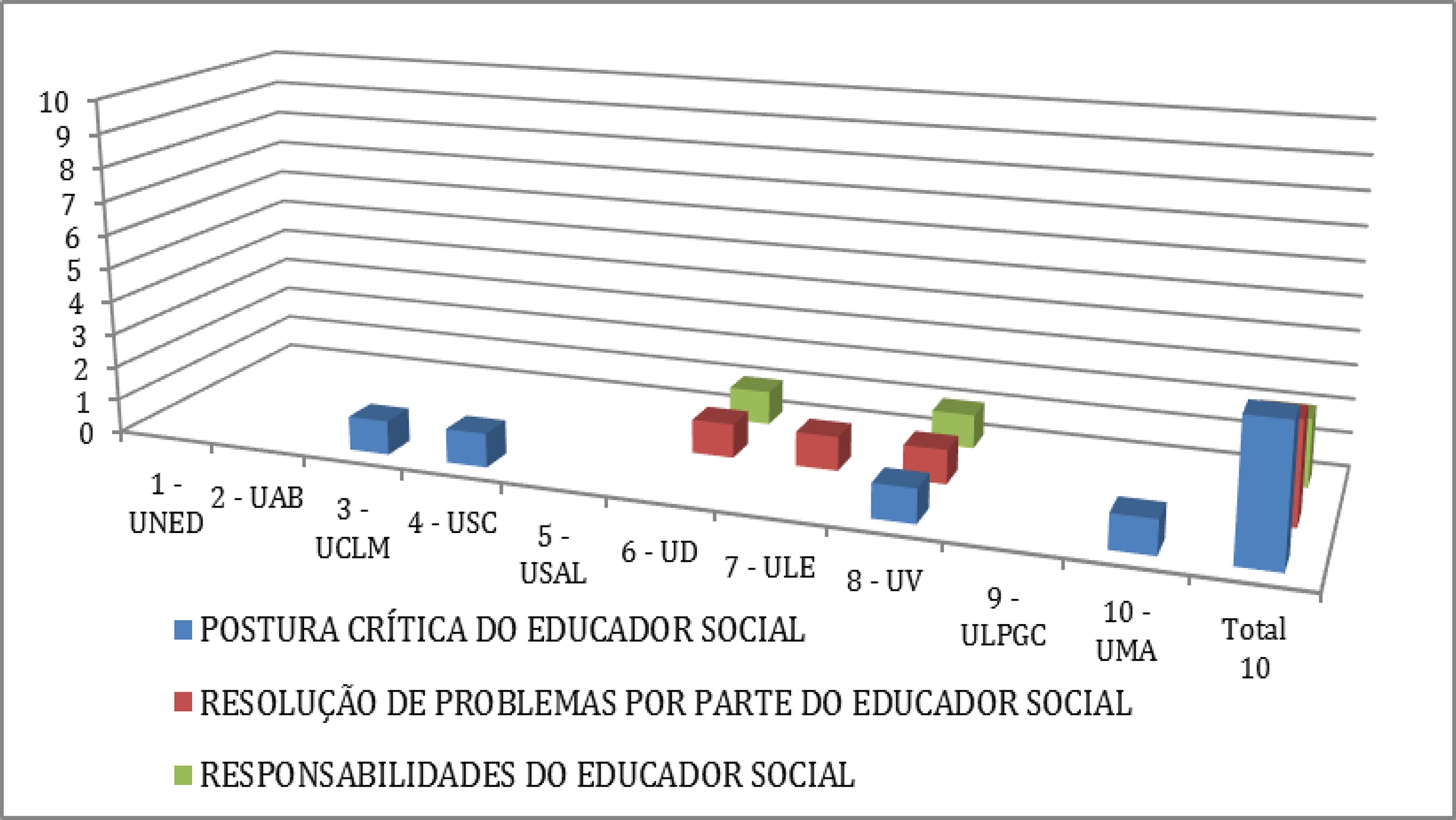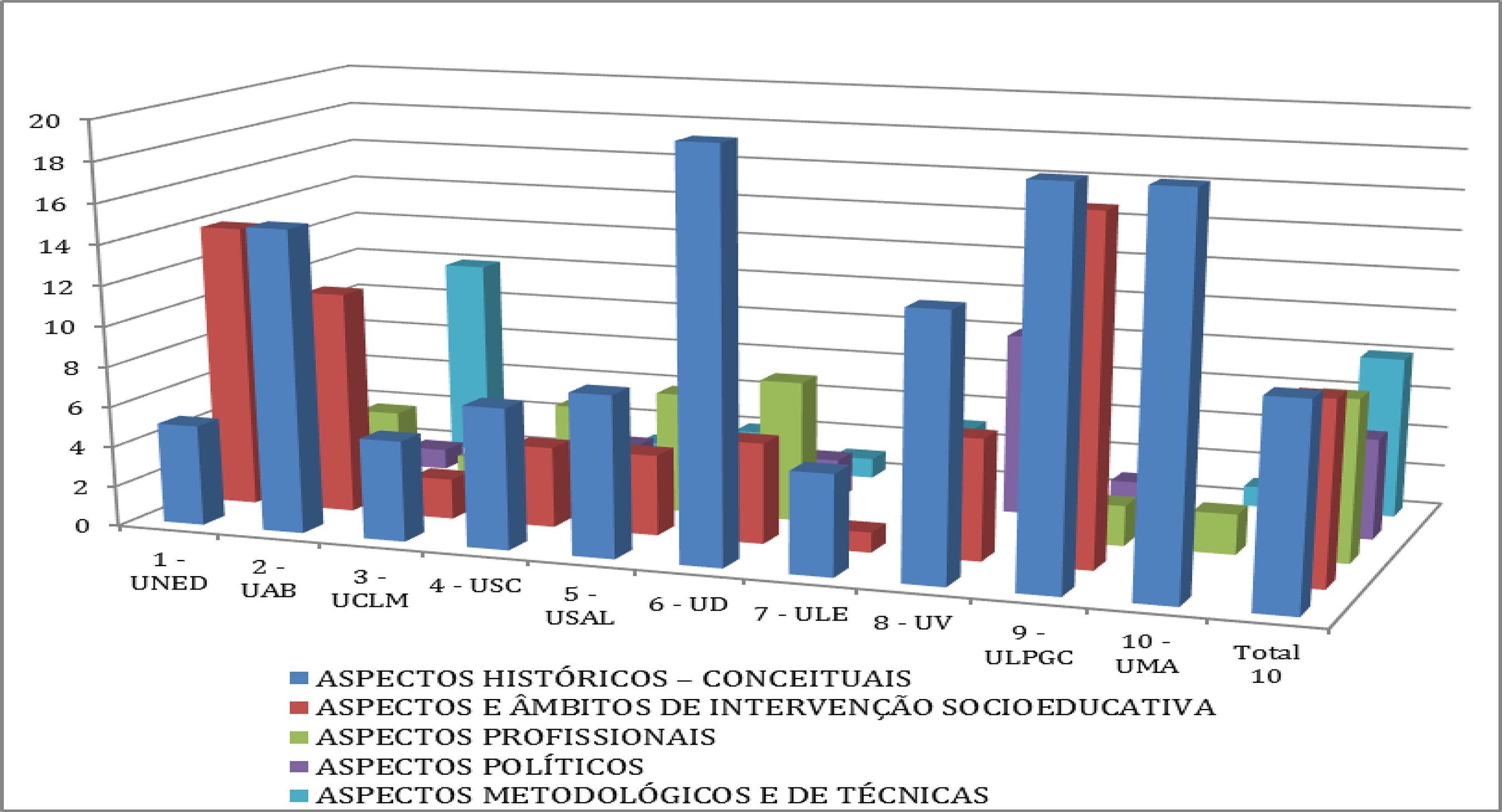 Em um primeiro momento, por meio do percurso histórico detalhado, foi possível compreender como a área adentra o meio acadêmico tornando-se uma disciplina científica e de formação profissional. Especificamente para chegar ao segundo objetivo específico, optou-se por uma análise profunda das ementas das disciplinas de Pedagogia Social que compõem o quadro de formação do curso de Graduação em Educação Social de dez universidades espanholas.