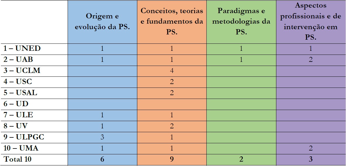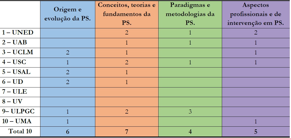 Competências Saber: Origem e evolução da PS; Conceitos, Teorias e Fundamentos da PS; Paradigmas e Metodologias da PS; Aspectos profissionais e de Intervenção em PS.