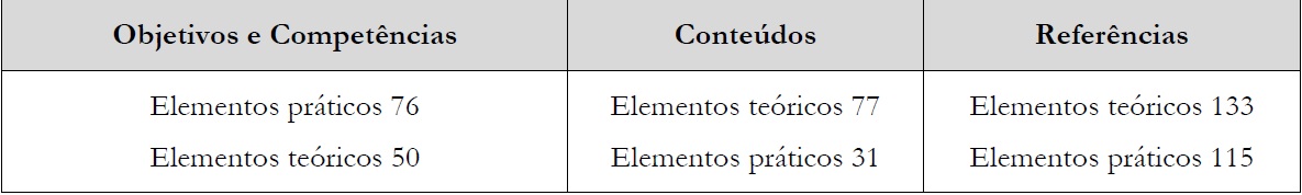 - Objetivos: Dentro dessa unidade de análise, nas ementas das disciplinas, aparecem diferentes itens que foram agrupados nas seguintes grandes categorias: Saber, Saber fazer, Saber ser. Cada grande categoria está dividida em categorias menores, que servem para organizar a análise de conteúdo proposta.