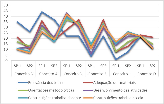 A síntese da avaliação das Semanas Pedagógicas desenvolvidas nos períodos 2007-2010 (denominado SP1) e 2011-2014 (denominado SP2), apresentadas no Gráfico 1, confirmam o pensamento dos pedagogos revelado nos excertos.