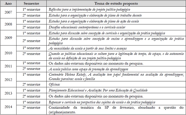 No Quadro 1 a seguir, estão apresentados os temas de estudo das Semanas Pedagógicas, realizadas no período de 2007 a 2014, propostos pela SEED/PR.