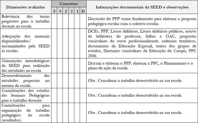 Para avaliação do programa, foram definidas seis dimensões: a) a relevância dos temas propostos para o trabalho docente na escola; b) a adequação dos materiais disponibilizados/ encaminhados pela SEED às escolas; c) as orientações metodológicas da SEED para realização das atividades na escola; d) o desenvolvimento das atividades propostas no interior da escola; e) as contribuições dos estudos das Semanas Pedagógicas para o trabalho docente; f) as contribuições para organização do trabalho pedagógico da escola (resultados).