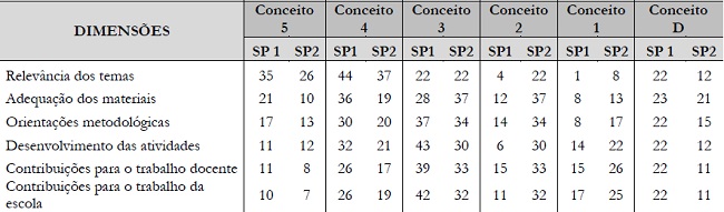 A Tabela 1 apresenta a comparação da avaliação das Semanas Pedagógicas desenvolvidas nos dois períodos (2007-2010 - SP1) e (2011-2014 - SP2), relativa aos conceitos (5, 4, 3, 2, 1, D) nas seis dimensões.