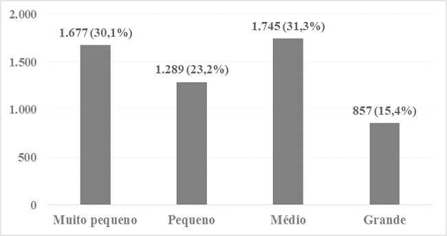 Ao explorar mais sobre o tamanho das Redes Municipais de Ensino, foram estabelecidas as seguintes categorias de porte em função do quantitativo de docentes: muito pequeno porte, contemplando os municípios com até 49 docentes; pequeno porte, referente àqueles com quantitativo variando de 50 a 99 docentes; médio porte, abrangendo as redes com 100 até 299 docentes; e grande porte, que possuem 300 ou mais docentes vinculados. Em 2016, o percentual de municípios cujas redes de ensino foram classificadas como sendo de pequeno porte representava 30,1%, contra 15,4% referentes aos de grande porte (Gráfico 1). As Redes Municipais de Ensino de pequeno e de médio porte totalizaram 23,2% e 31,3% dos municípios do país, respectivamente.