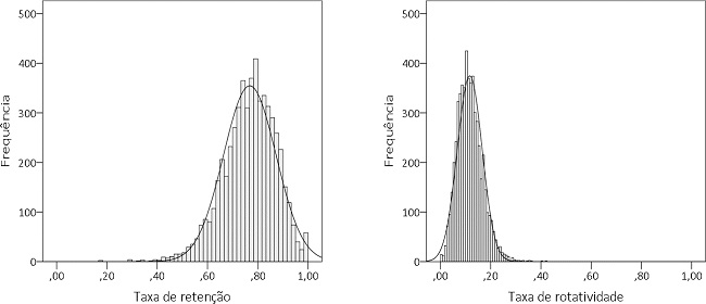 A operacionalização da taxa de retenção e da taxa de rotatividade docente das Redes Municipais de Ensino e a distribuição dos resultados obtidos dos municípios de todo o país são apresentadas no Gráfico 2. Ambas possuem zero como sendo o valor mínimo possível e um como o máximo possível. Considerando tais valores, a taxa de retenção docente concentrou-se, em grande medida, no intervalo superior ao ponto médio (0,5), e a taxa de rotatividade distribuiu-se no intervalo inferior.