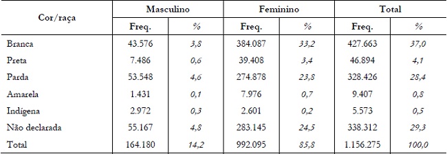 Com base nos dados do Censo Escolar, esta seção fornece informações sobre características dos docentes das Redes Municipais de Ensino no Brasil e apresenta os resultados das taxas de retenção e de rotatividade obtidas junto aos 5.568 municípios do país. A distribuição dos docentes das Redes Municipais de Ensino no Brasil, simultaneamente em relação à raça ou cor e ao sexo, mostrou que os maiores percentuais foram registrados junto às mulheres brancas e às mulheres pardas, equivalentes a 33,2% e 23,8% do total, respectivamente (Tabela 1). Ficou evidenciada a predominância de mulheres na Educação Básica. Embora a distribuição dos profissionais em relação ao sexo não tenha sido segmentada de acordo com a etapa da Educação Básica, a participação feminina na Educação Infantil é muito superior à masculina, e essa diferença vai diminuindo à medida que se avança nas etapas e nos níveis de ensino. Por outro lado, identifica-se a persistência da dificuldade do Censo Escolar em obter a informação de cor/raça dos docentes, cuja parcela sem a declaração dessa variável atinge quase 30% do total de profissionais.