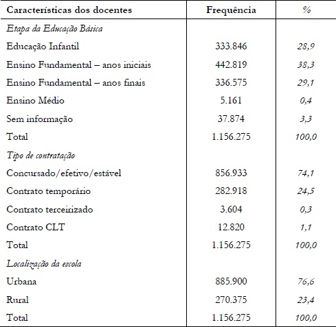 Levando em consideração a localização das escolas, registrou-se parcela de 76,6% de docentes das Redes Municipais de Ensino que atuavam nas áreas urbanas (Tabela 2). Cabe salientar que a vasta quantidade de municípios existentes no país difere muito em relação à participação de pessoas residentes em áreas urbanas e em áreas rurais.