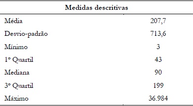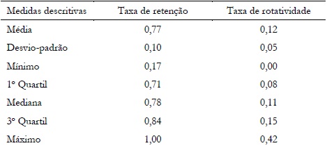 Antes de apresentar as taxas de retenção e de rotatividade docentes das Redes Municipais de Ensino do país, vale ressaltar que essas redes apresentaram tamanhos bem diferenciados em relação à quantidade de profissionais, contando a menor com somente três docentes, e a maior, com 36.984 (Tabela 3). A média aritmética geral foi de 207,7 docentes por Rede Municipal de Ensino e o desvio-padrão de 713,6. Com base na mediana obtida, é possível afirmar que a metade das Redes Municipais de Ensino possuía até 43 docentes e, a outra parte, acima desse valor. Em relação aos municípios com maiores quantidades de docentes a eles vinculados, um quarto deles (1.392) detinha mais de 199 desses profissionais.