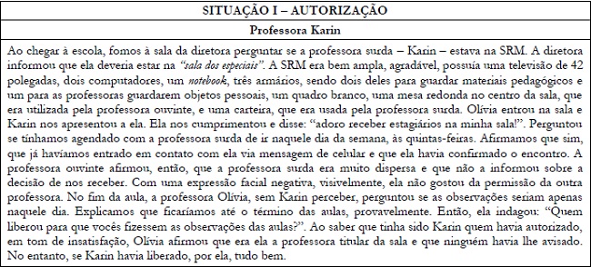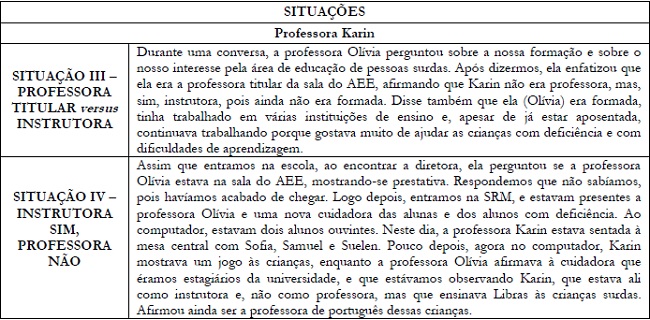Essa invisibilidade do trabalho de Karin foi percebida também na situação IV, quando a diretora da escola, mesmo sabendo que a pesquisa estava sendo realizada com a professora surda, perguntava pela ouvinte. Quando fizemos as primeiras visitas à escola, a diretora e a vice informaram que havia uma professora surda trabalhando ali, porém não sabiam ao menos os dias e os horários em que ela trabalhava, embora esse trabalho fosse diário. A invisibilidade do papel das docentes surdas expressou-se também durante a pesquisa exploratória, quando a coordenadora da Educação Especial de João Pessoa afirmou que não existiam professoras surdas e professores surdos trabalhando com crianças surdas, o que durante a pesquisa mostrou-se o contrário.