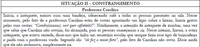 Assim, sobre as relações entre professoras surdas e professoras ouvintes, reforçamos: embora saibamos que existem relações de poder em todas as interações sociais, é preciso que se relativize a concepção de que determinado sujeito é sempre o dominado. Todavia, nas relações de força estabelecidas, geralmente são os sujeitos surdos que sofrem, passando, inclusive, a serem vítimas de violência, como veremos na situação a seguir: