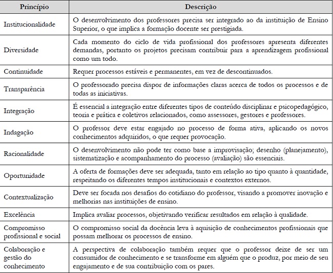 Os princípios que devem orientar esse desenvolvimento são descritos por Marcelo Garcia (2006 apudMAYOR RUIZ, 2009), estando sistematizados no Quadro 1.