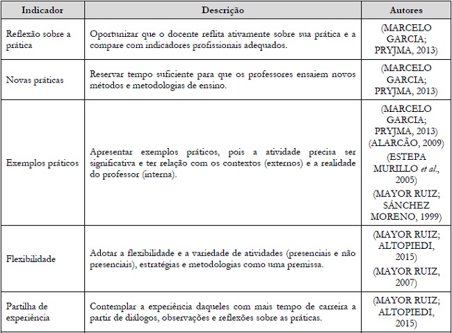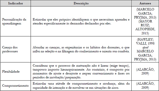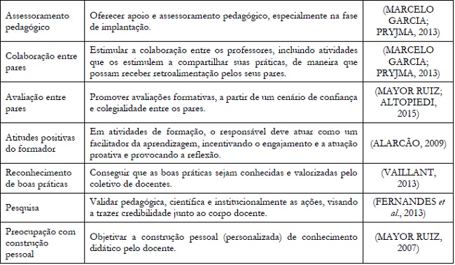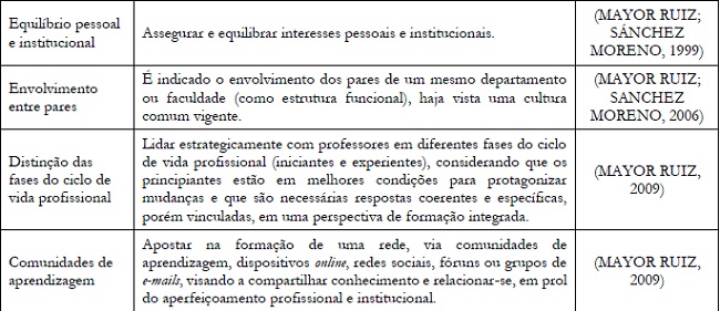 Após essa primeira sistematização, foi realizada nova leitura para análise dos dados, ressaltando as evidências relacionadas aos princípios que permitiam orientar o desenvolvimento profissional docente (MARCELO GARCIA, 2006 apudMAYOR RUIZ, 2009) e à matriz de fomento ao desenvolvimento profissional docente, categorizados em relação às estratégias que podem ser desenvolvidas pelas instituições (Quadro 2) e ao envolvimento docente necessário para o sucesso dessas ações (Quadro 3). A última análise dos dados considerou o conceito de colaboração entre pares (HARGREAVES, 1998) que mobilizou a realização desta investigação.
