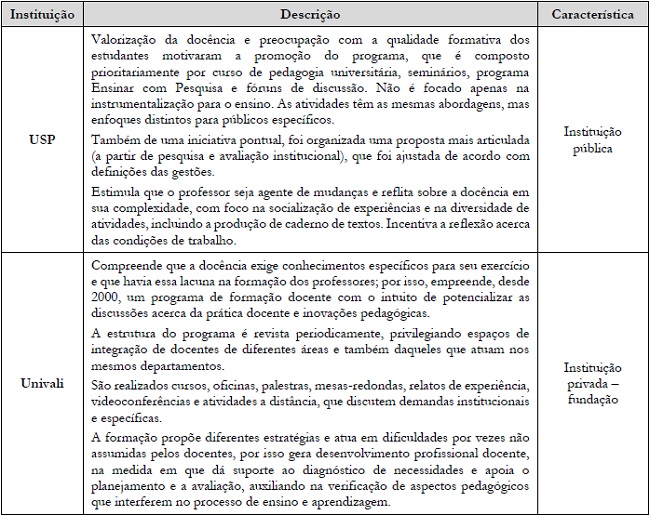 A partir da leitura e da análise dos documentos, elaborou-se, com apoio de uma planilha de controle, uma descrição detalhada das quatro iniciativas e dos dispositivos que constituem a experiência de cada universidade, considerando a categorização presente nos estudos de casos da USP e da Univali, que são parte de pesquisa interinstitucional desenvolvida na Universidade de Brasília (UnB) e no Centro Universitário de Brasília (UniCEUB)1, entre 2009 e 2012, tendo por objetivo refletir sobre as possibilidades e os limites dos programas de desenvolvimento profissional, em uma perspectiva institucional, para o exercício da docência na educação superior (VEIGA et al., 2012). As categorias eram: premissa ou ideia inicial; cenário; objetivos; inserção na estrutura administrativa; pressupostos teórico-metodológicos; características das estruturas organizacionais; práticas formativas desenvolvidas; e importância atribuída aos programas e aos limites, todas derivadas dos objetivos do estudo mencionado.