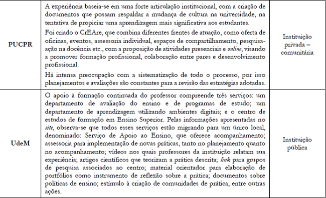 Para a seleção dos programas de formação que seriam analisados, inicialmente foi realizada uma revisão de literatura (artigos científicos e/ou livros), buscando identificar informações sobre a existência de programas de formação institucionalizados e que descrevessem estratégias de formação diversificada. Nessa busca, foram identificados dois programas, mencionados em relato de artigos, que tinham essa característica: os centros de formação docente da USP e da Univali. A escolha do Centro de Ensino e Aprendizagem (CrEAre) da PUCPR e do Centre d'Études et de Formation en Enseignement Supérieur (CEFES) da UdeM deu-se por serem os centros das instituições vinculadas às pesquisadoras desta investigação (Quadro 4).